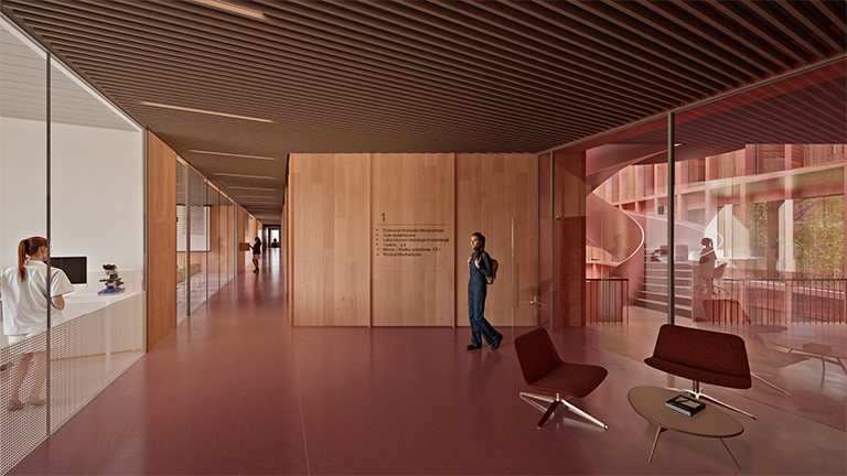 At the heart of the building, a bright, top-lit atrium links all levels and programmes. Its expression is warm, simple, and materially rooted in Wrocław’s brick-built heritage. This central space becomes a place for exchange, reinforcing the HTSH’s collaborative spirit.